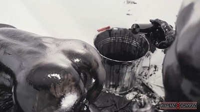 Preparing for a wet, sticky scene, inked up Asian muscle daddy Damian Dragon and his tatted son Yoshi splatter a thick coat of oily black goo over their heads, soon coating their entire bodies in shiny black gunge. Hands reach down to jerk each other's swelling tools, and Damian chews on the ring through Yoshi's gleaming black nipple.